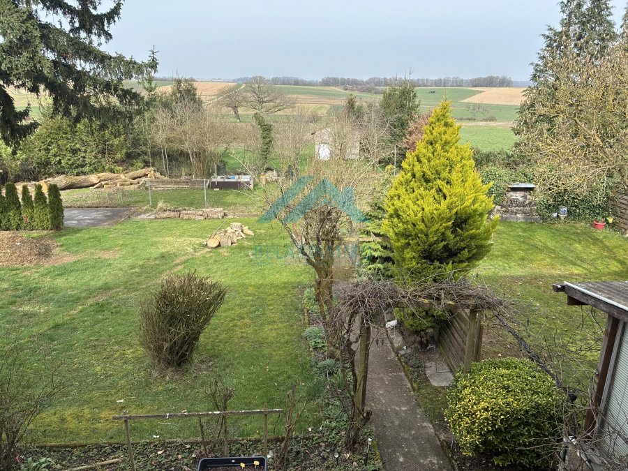 Baussen fannt Dir e schéine Gaart mat Beem a Vue op d'Landschaft (landwirtschaftlech Fläch, net baulandeg). E Brunn mat Pompel an e Reewaasser-Sammelbehälter mat enger Kapazitéit vun 6000 m³.