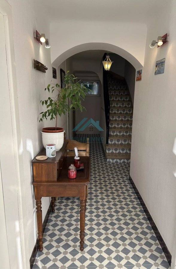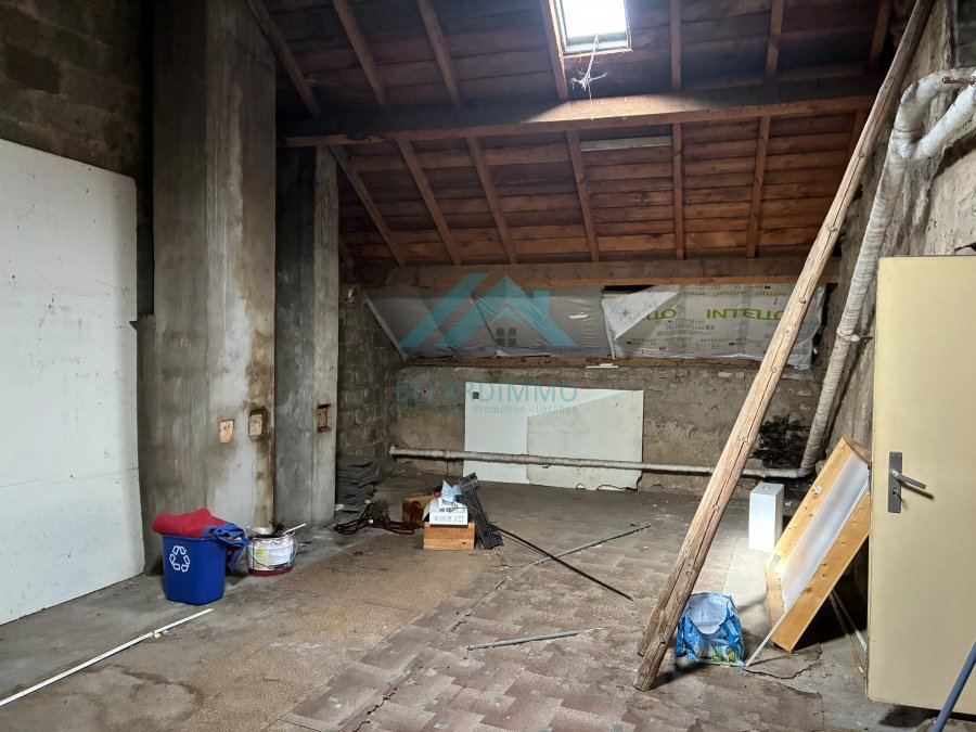 Et gëtt och Zougang zum Keller. - Op der éischter Etage: dräi geräumeg Schlofkummeren, e Buedzëmmer an e separaten WC. - Op der zweeter Etage: zwou Schlofkummeren, déi eng Renovatioun brauchen, an e voll konvertiblen Daachgeschoss mat 50 m² Buedemfläch an 4 Meter héije Plafongen.